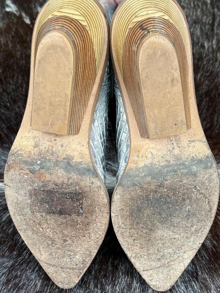 The silver leather is croc-embossed and structured with subtle western topstitching and pull tabs. Interior is fully lined in smooth tan leather with Fendi logo embossing. A true collector’s boot that transforms jeans, dresses, or tailored looks with one step. They're also worn in just the right amount, making them comfortable from first wear.